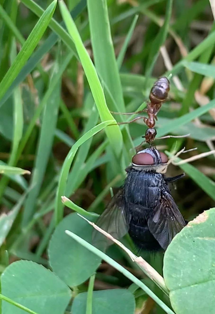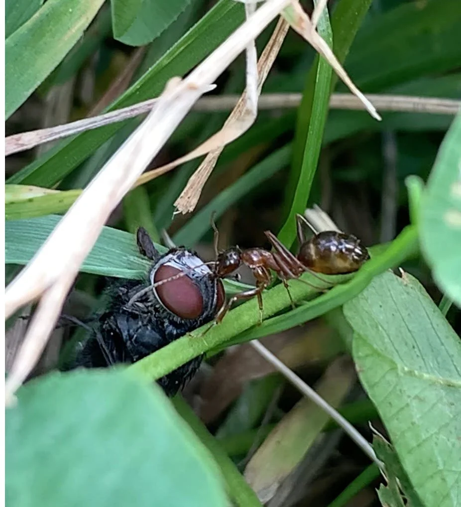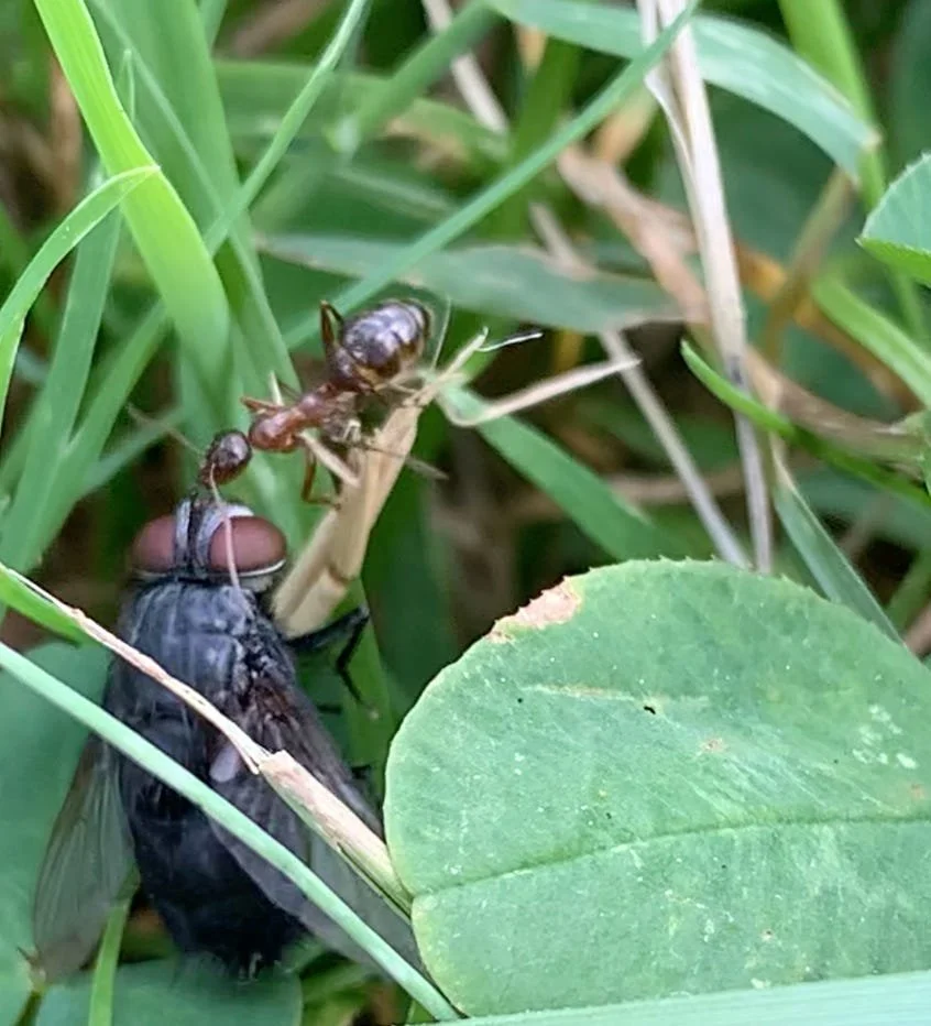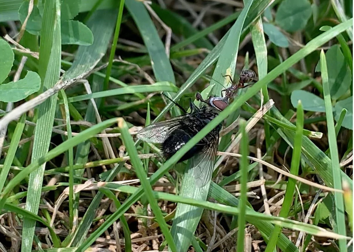 video stills of an ant working exceedingly hard to drag a dead fly across the grass